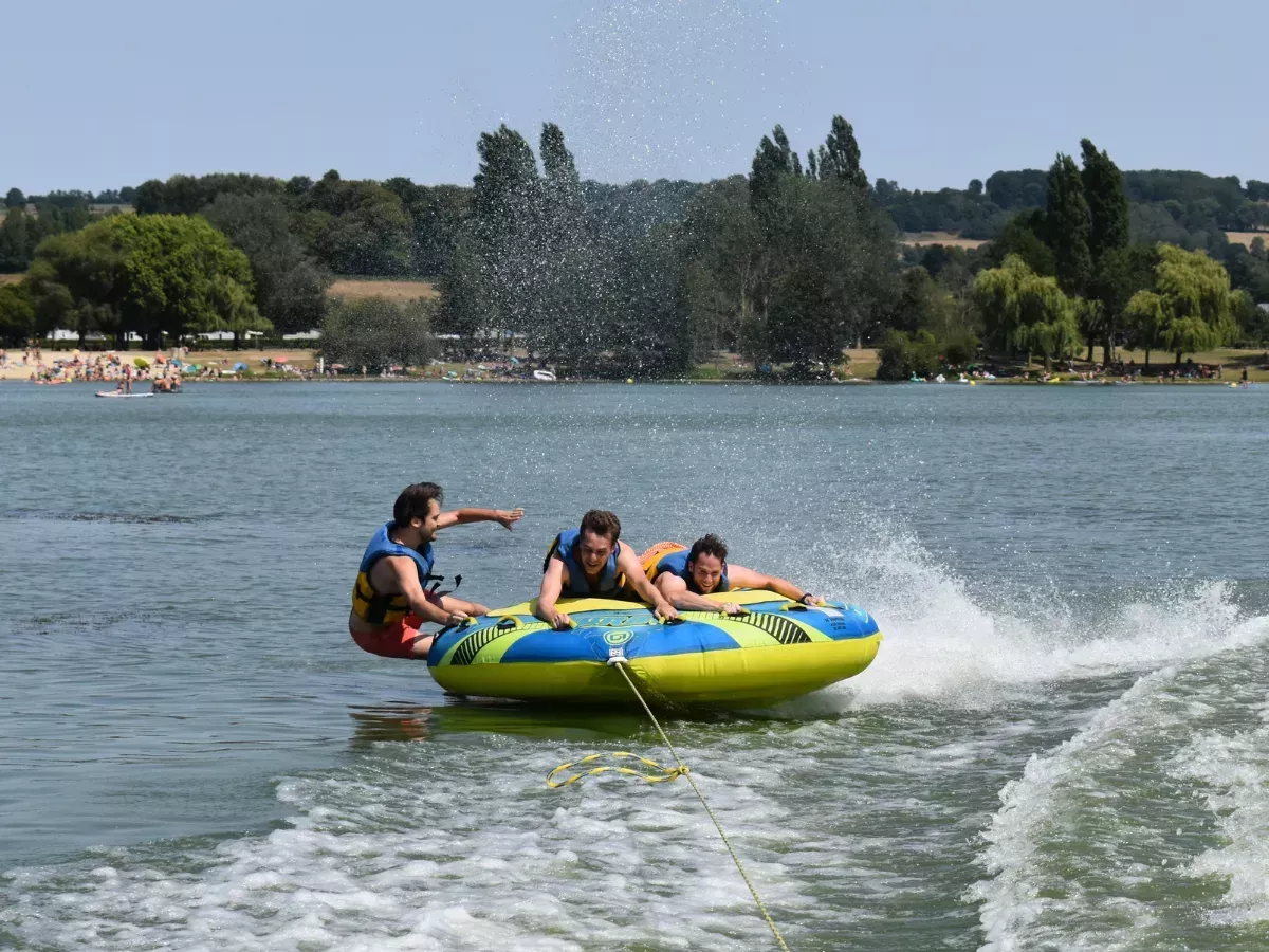 Parmi les activités phares du lac, la bouée tractée est une expérience aquatique rafraîchissante et pleine de sensations ! 💦 Installée au cœur de la base nautique, cette attraction est proposée avec encadrement et briefing sécurité avant chaque session. Vous montez à bord d’une bouée ronde, confortable et stable, puis un bateau démarre sa course sur l’eau : vitesse, virages, éclaboussures et fous rires garantis !