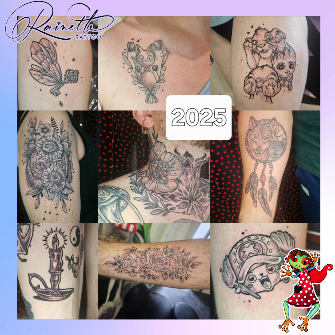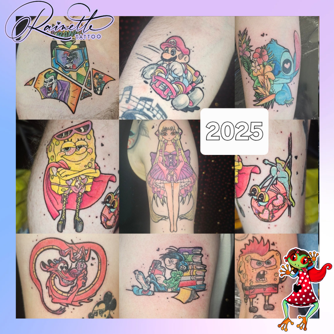 🎨 Chez Rainette Tattoo, on vient autant pour l’univers que pour le coup d’aiguille. Tiffany (alias Rainette) tatoue depuis plusieurs années et s’est forgé une signature visuelle très reconnaissable : un new school dynamique, des références pop culture assumées, et ce petit côté “madeleine de Proust” qui fait sourire quand on reconnaît un clin d’œil à un dessin animé ou à une époque. Son truc, ce sont les pièces expressives, souvent colorées, avec des contours travaillés et une énergie positive.